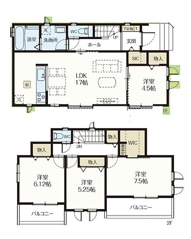 | 間取り | 4LDK(4LDK+WIC+SIC) 間取り内訳:リビングダイニングキッチン 17帖(1階)・洋室 4.5帖(1階)・洋室 7.5帖(2階)・洋室 5.2帖(2階)・洋室 6.1帖(2階) |