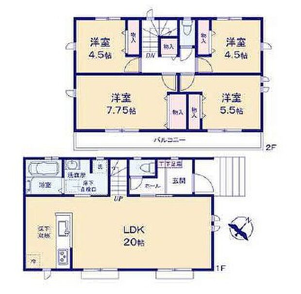 | 間取り | 4LDK 間取り内訳:リビングダイニングキッチン 20帖(1階)・洋室 7.7帖(2階)・洋室 5.5帖(2階)・洋室 4.5帖(2階)x2 |