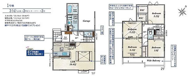 間取り内訳:リビングダイニングキッチン 18.4帖(1階)・洋室 5帖(2階)・洋室 11.3帖(2階)・洋室 5.2帖(2階)