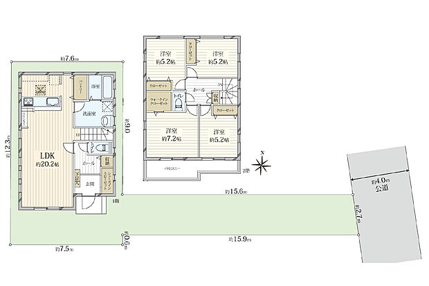 | 間取り | 4LDK 間取り内訳:リビングダイニングキッチン 20.2帖(1階)・洋室 7.2帖(2階)・洋室 5.2帖(2階)x3 |