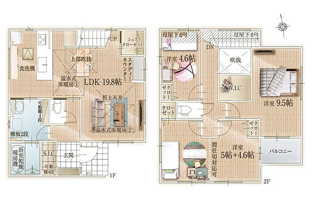間取り内訳:リビングダイニングキッチン 19.8帖(1階)・洋室 9.6帖(2階)・洋室 9.5帖(2階)・洋室 4.6帖(2階)