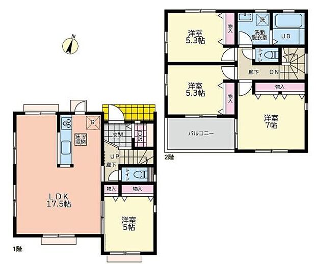 間取り内訳:リビングダイニングキッチン 17.5帖(1階)・洋室 5帖(1階)・洋室 5.3帖(2階)・洋室 5.3帖(2階)・洋室 7帖(2階)