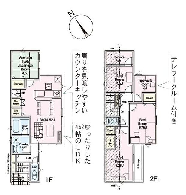 | 間取り | 4LDK 間取り内訳:リビングダイニングキッチン 14.6帖(1階)・和室 4.5畳(1階)・洋室 4.5帖(2階)・洋室 6.7帖(2階)・洋室 7.2帖(2階) |