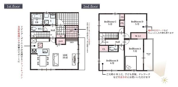 | 間取り | 4LDK 間取り内訳:リビングダイニングキッチン 18帖(1階)・洋室 7.5帖(2階)・洋室 6.5帖(2階)・洋室 5.7帖(2階)・洋室 5.2帖(2階) |