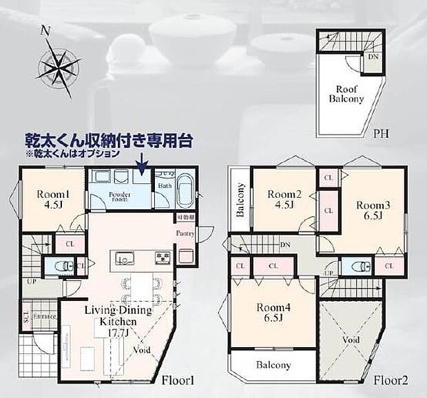 間取り内訳:リビングダイニングキッチン 17.7帖(1階)・洋室 4.5帖(1階)・洋室 4.5帖(2階)・洋室 6.5帖(2階)・洋室 6.5帖(2階)
