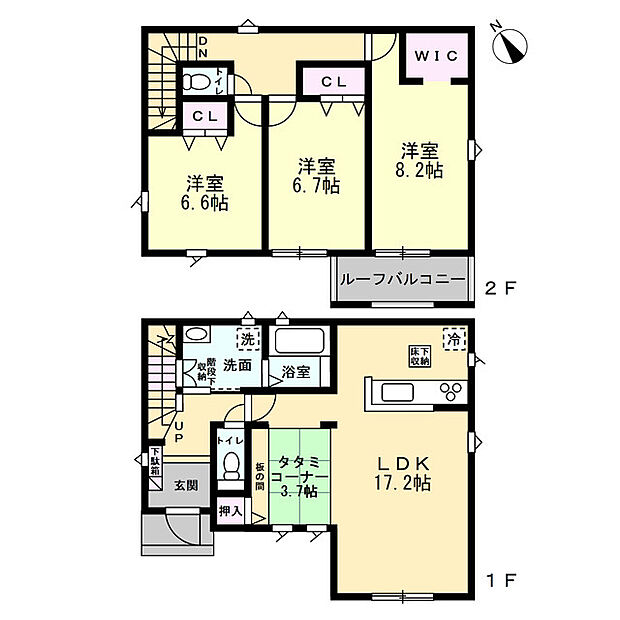 | 間取り | 4LDK 間取り内訳:リビングダイニングキッチン 17.2帖・和室 3.7畳・洋室 8.2帖・洋室 6.7帖・洋室 6.6帖 |