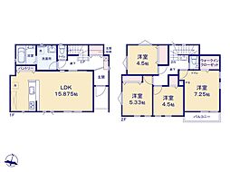 | 間取り | 3SLDK(その他:畳コーナー4帖) 間取り内訳:リビングダイニングキッチン 16帖(1階)・洋室 7.5帖(2階)・洋室 6帖(2階)・洋室 4.8帖(2階)・収納(2階) |