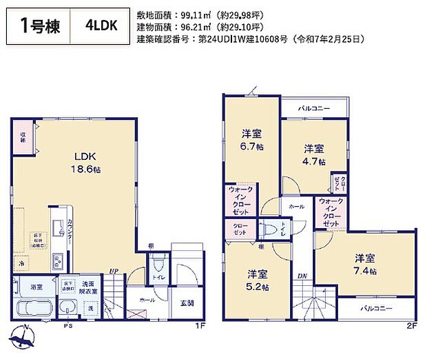 | 間取り | 4LDK 間取り内訳:リビングダイニングキッチン 18.6帖(1階)・洋室 5.2帖(2階)・洋室 6.7帖(2階)・洋室 4.7帖(2階)・洋室 7.4帖(2階) |
