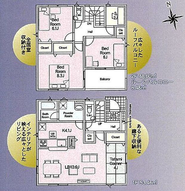 間取り内訳:リビングダイニングキッチン 13.6帖(1階)・和室 4畳(1階)・洋室 8.3帖(2階)・洋室 6.1帖(2階)・洋室 6帖(2階)・収納 2帖(2階)
