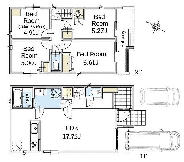 対面キッチン採用のLDKは17畳。並列2台駐車可能な2階建て新築住宅です。