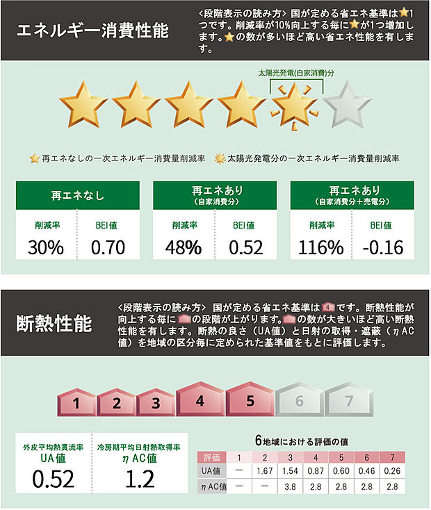 - 星マークの数が多いほどエネルギー消費性能が高いことを示しています。再エネ設備のない住宅は★0~★4の5段階評価、再エネ設備がある住宅は★0~★6の7段階評価となります。