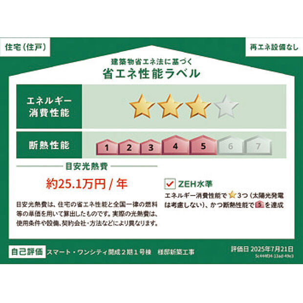 - 星マークの数が多いほどエネルギー消費性能が高いことを示しています。再エネ設備のない住宅は★0~★4の5段階評価、再エネ設備がある住宅は★0~★6の7段階評価となります。