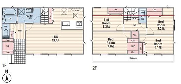 間取り内訳:リビングダイニングキッチン 19.4帖(1階)・洋室 7.1帖(2階)・洋室 5.3帖(2階)・洋室 5.2帖(2階)・洋室 5.1帖(2階)