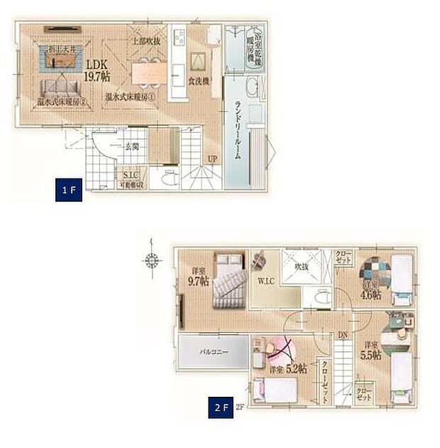 間取り内訳:リビングダイニングキッチン 19.7帖(1階)・洋室 9.7帖(2階)・洋室 5.2帖(2階)・洋室 5.5帖(2階)・洋室 4.6帖(2階)