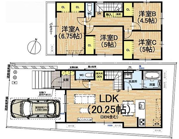 | 間取り | 4LDK 間取り内訳:リビングダイニングキッチン 20.2帖(1階)・洋室 6.7帖(2階)・洋室 5帖(2階)・洋室 5帖(2階)・洋室 4.5帖(2階) |
