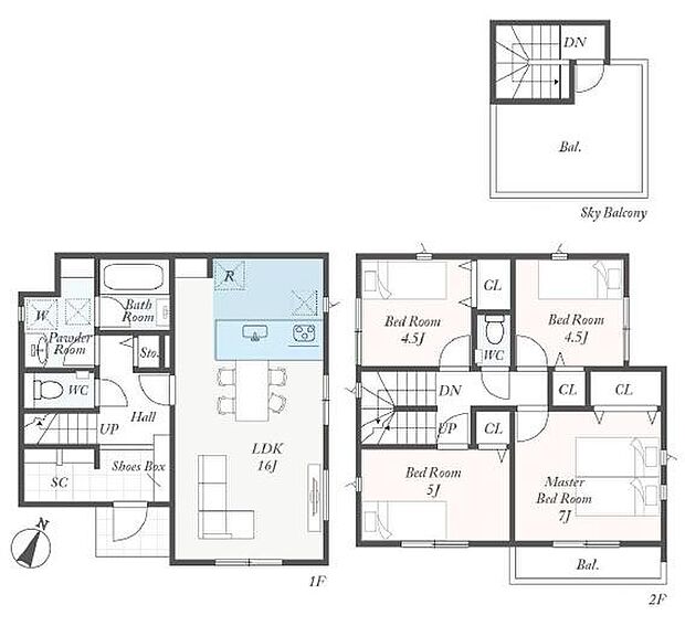 間取り内訳:リビングダイニングキッチン 16帖(1階)・洋室 4.5帖(2階)・洋室 5帖(2階)・洋室 7帖(2階)・洋室 4.5帖(2階)