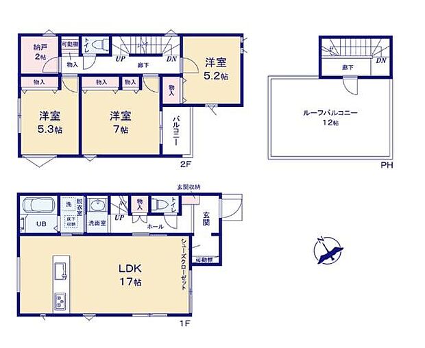 | 間取り | 3LDK 間取り内訳:リビングダイニングキッチン 17帖(1階)・洋室 5.3帖(2階)・洋室 7帖(2階)・洋室 5.2帖(2階) |