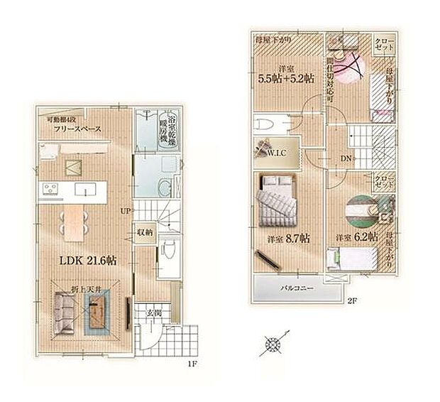 | 間取り | 3LDK 間取り内訳:リビングダイニングキッチン 21.6帖(1階)・洋室 10.7帖(2階)・洋室 8.7帖(2階)・洋室 6.2帖(2階) |