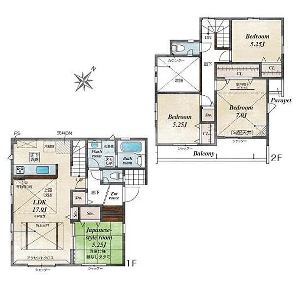 | 間取り | 4LDK 間取り内訳:リビングダイニングキッチン 17帖(1階)・和室 5.2畳(1階)・洋室 5.2帖(2階)・洋室 7帖(2階)・洋室 5.2帖(2階) |
