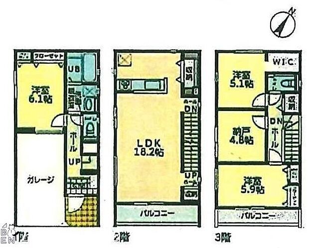 | 間取り | 3SLDK 間取り内訳:リビングダイニングキッチン 18.2帖(2階)・洋室 6.1帖(1階)・洋室 5.9帖(3階)・洋室 5.1帖(3階)・収納 4.8帖(3階) |