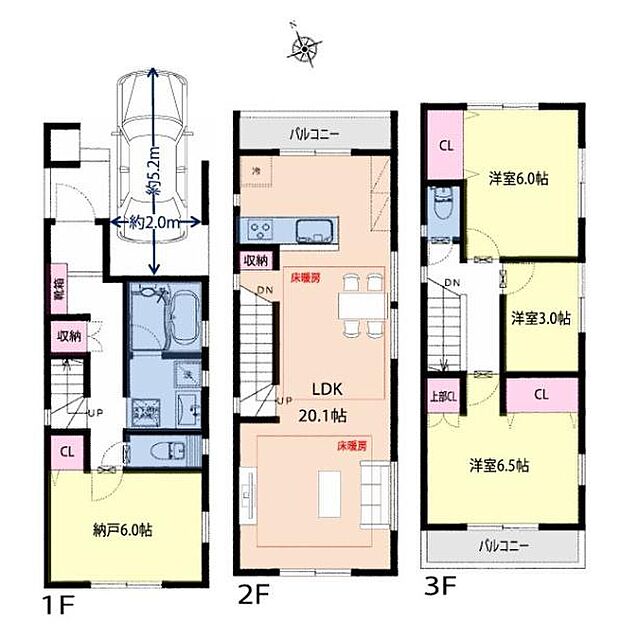 | 間取り | 2SLDK 間取り内訳:収納 6帖(1階)・リビングダイニングキッチン 20.1帖(2階)・洋室 6帖(3階)・収納 3帖(3階)・洋室 6.5帖(3階) |