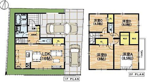 | 間取り | 4LDK 間取り内訳:リビングダイニングキッチン 16帖(1階)・洋室 8.5帖(2階)・洋室 8帖(2階)・洋室 6.5帖(2階)・洋室 4.5帖(2階) |