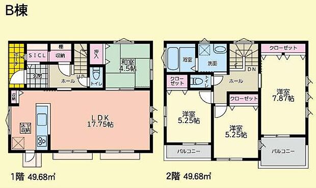 | 間取り | 4LDK 間取り内訳:リビングダイニングキッチン 17.7帖(1階)・和室 4.5畳(1階)・洋室 5.2帖(2階)・洋室 5.2帖(2階)・洋室 7.8帖(2階) |