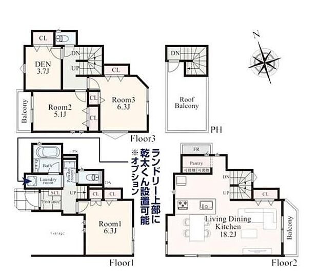 | 間取り | 3SLDK 間取り内訳:洋室 6.3帖(1階)・リビングダイニングキッチン 18.2帖(2階)・収納 3.7帖(3階)・洋室 5.1帖(3階)・洋室 6.3帖(3階) |