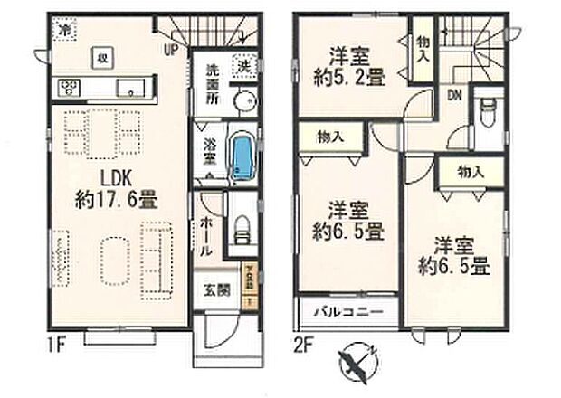 | 間取り | 3LDK 間取り内訳:リビングダイニングキッチン 17.6帖(1階)・洋室 6.5帖(2階)x2・洋室 5.2帖(2階) |