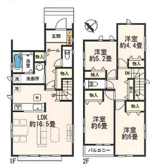 | 間取り | 4LDK 間取り内訳:リビングダイニングキッチン 16.5帖(1階)・洋室 6帖(2階)x2・洋室 5.2帖(2階)・洋室 4.4帖(2階) |