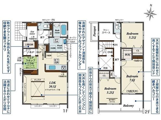 | 間取り | 3LDK 間取り内訳:リビングダイニングキッチン 20.5帖(1階)・洋室 5.2帖(2階)・洋室 7帖(2階)・洋室 5.2帖(2階) |