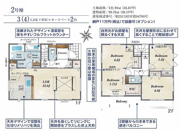 | 間取り | 3LDK(将来4LDKに対応可。) 間取り内訳:リビングダイニングキッチン 18帖(1階)・洋室 5帖(2階)・洋室 6帖(2階)・洋室 11.2帖(2階) |