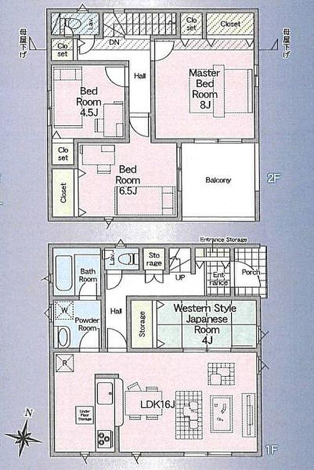 | 間取り | 4LDK 間取り内訳:リビングダイニングキッチン 16帖(1階)・和室 4畳(1階)・洋室 4.5帖(2階)・洋室 6.5帖(2階)・洋室 8帖(2階) |