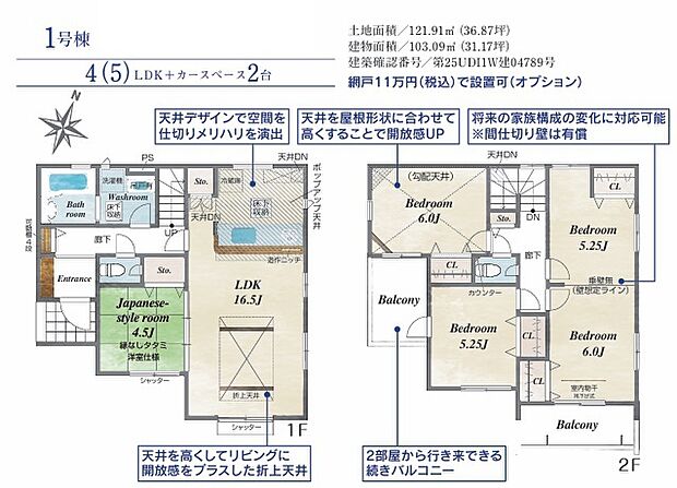 | 間取り | 4LDK(将来5LDKに対応可。) 間取り内訳:洋室 11.2帖(2階)・リビングダイニングキッチン 16.5帖(1階)・和室 4.5畳(1階)・洋室 5.2帖(2階)・洋室 6帖(2階) |