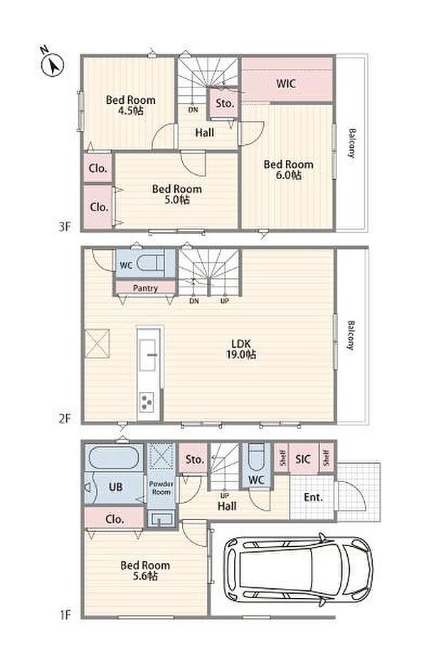 | 間取り | 4LDK 間取り内訳:洋室 5.6帖(1階)・リビングダイニングキッチン 19帖(2階)・洋室 4.5帖(3階)・洋室 5帖(3階)・洋室 6帖(3階) |