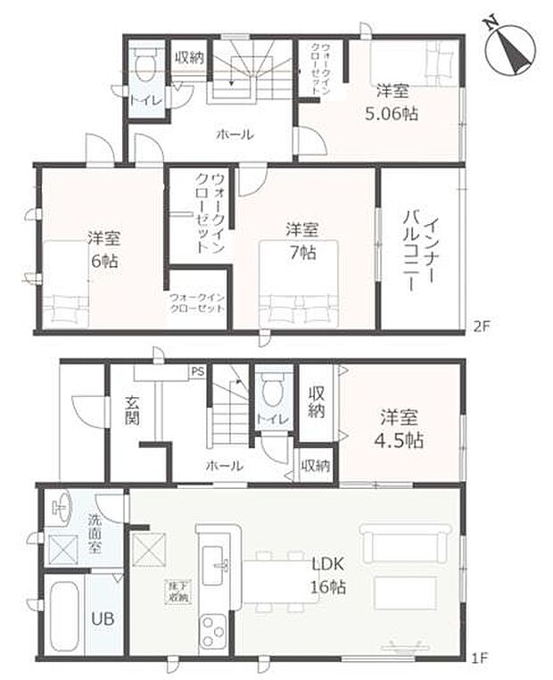 | 間取り | 4LDK 間取り内訳:リビングダイニングキッチン 16帖(1階)・洋室 4.5帖(1階)・洋室 5帖(2階)・洋室 6帖(2階)・洋室 7帖(2階) |