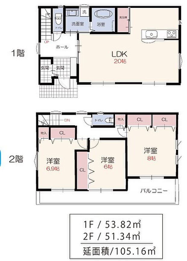 | 間取り | 3LDK 間取り内訳:リビングダイニングキッチン 20帖(1階)・洋室 6帖(2階)・洋室 6.9帖(2階)・洋室 8帖(2階) |
