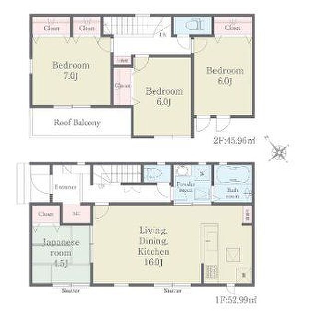 間取り内訳:リビングダイニングキッチン 16帖(1階)・和室 4.5畳(1階)・洋室 7帖(2階)・洋室 6帖(2階)・洋室 6帖(2階)