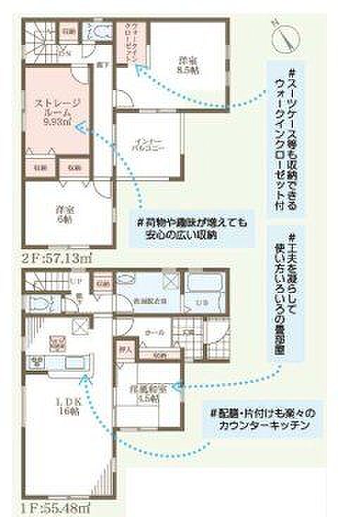 | 間取り | 3SLDK 間取り内訳:リビングダイニングキッチン 16帖(1階)・和室 4.5畳(1階)・洋室 8.5帖(2階)・洋室 6帖(2階)・収納(2階) |