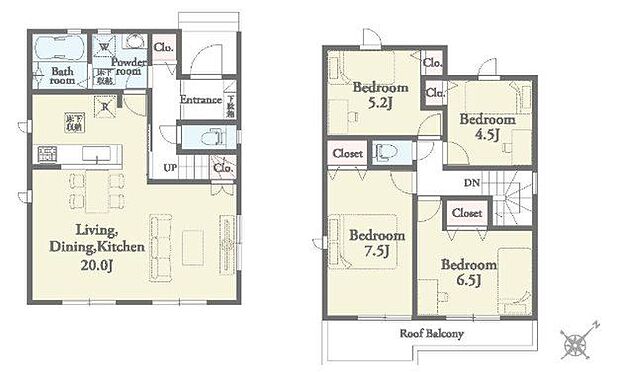 | 間取り | 4LDK 間取り内訳:リビングダイニングキッチン 20帖(1階)・洋室 7.5帖(2階)・洋室 6.5帖(2階)・洋室 5.2帖(2階)・洋室 4.5帖(2階) |