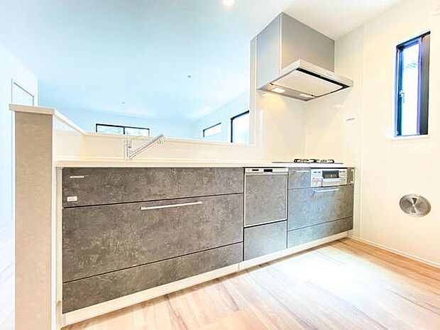 道路からの視線が気にならない2階リビング。キッチンには忙しい家事を助ける食洗器付きです。建物完成済。
