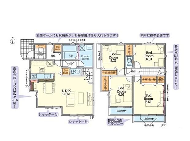 | 間取り | 4LDK 間取り内訳:洋室 5.2帖(2階)・洋室 6帖(2階)・洋室 8.5帖(2階)・洋室 6帖(2階)・リビングダイニングキッチン 20.6帖(1階) |