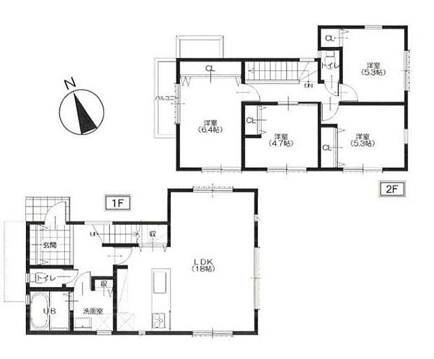 | 間取り | 4LDK 間取り内訳:リビングダイニングキッチン 18帖(1階)・洋室 6.4帖(2階)・洋室 4.7帖(2階)・洋室 5.3帖(2階)・洋室 5.3帖(2階) |