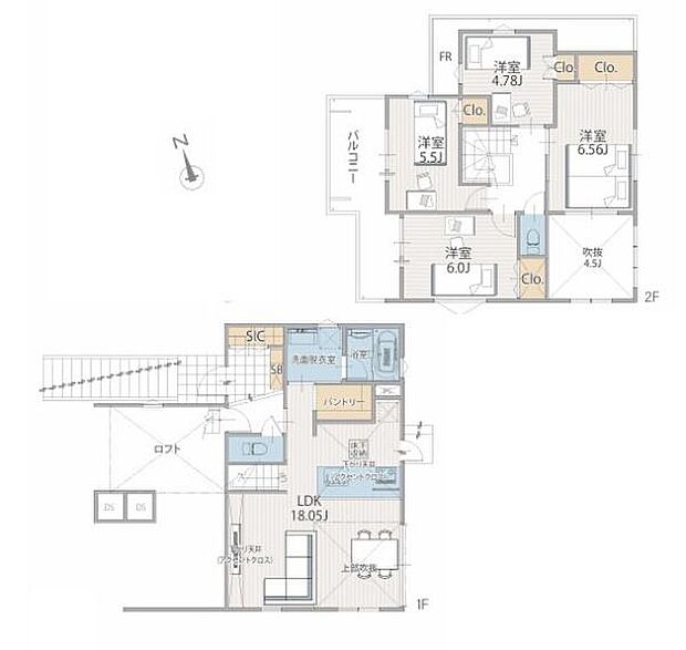 間取り内訳:リビングダイニングキッチン 18帖(1階)・洋室 4.7帖(2階)・洋室 5.5帖(2階)・洋室 6帖(2階)・洋室 6.5帖(2階)