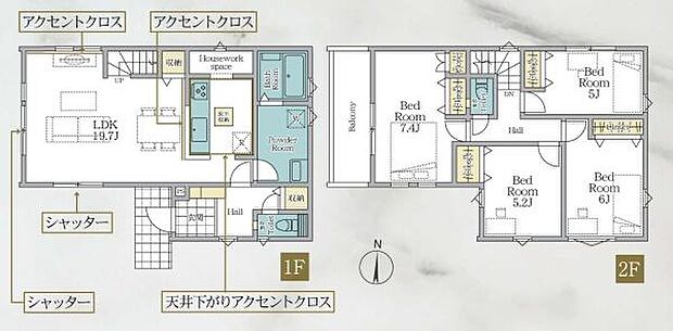 | 間取り | 4LDK 間取り内訳:リビングダイニングキッチン 19.7帖(1階)・洋室 7.4帖(2階)・洋室 5.2帖(2階)・洋室 6帖(2階)・洋室 5帖(2階) |