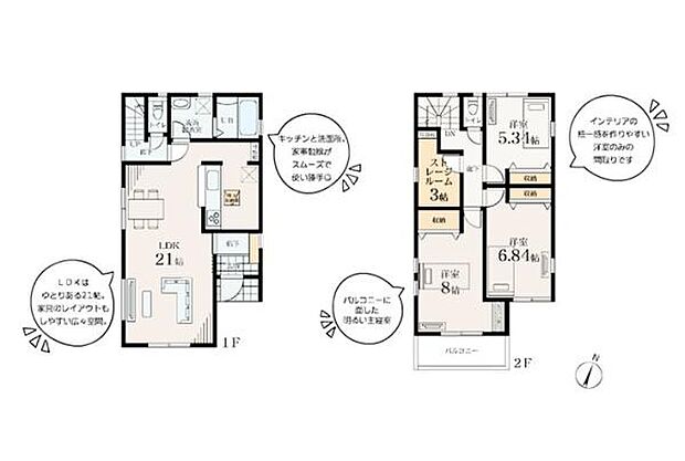| 間取り | 3SLDK 間取り内訳:リビングダイニングキッチン 21帖(1階)・洋室 5.3帖(2階)・洋室 6.8帖(2階)・洋室 8帖(2階)・収納 3帖(2階) |
