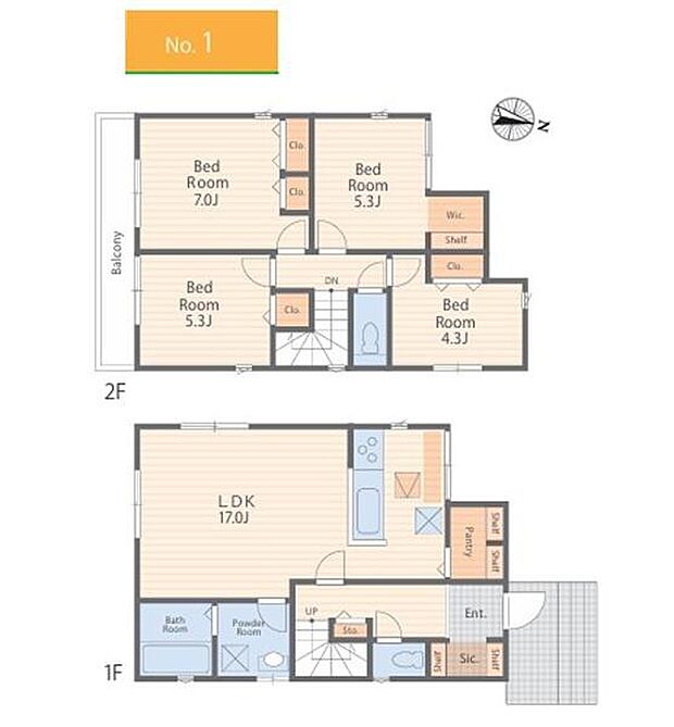 | 間取り | 4LDK 間取り内訳:リビングダイニングキッチン 17帖(1階)・洋室 7帖(2階)・洋室 5.3帖(2階)・洋室 5.3帖(2階)・洋室 4.3帖(2階) |
