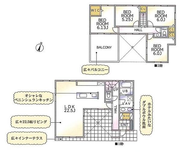 | 間取り | 4LDK 間取り内訳:リビングダイニングキッチン 22.5帖(1階)・洋室 6.1帖(2階)・洋室 5.2帖(2階)・洋室 6帖(2階)・洋室 6帖(2階) |