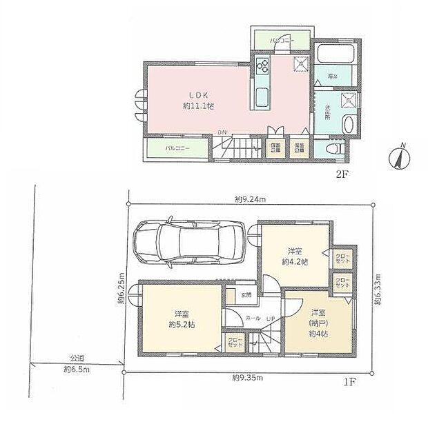 | 間取り | 2SLDK 間取り内訳:洋室 4.2帖(1階)・洋室 5.2帖(1階)・収納 4帖(1階)・リビングダイニングキッチン 11.1帖(2階) |