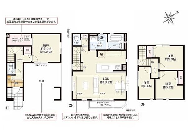 | 間取り | 2SLDK 間取り内訳:収納 8.4帖(1階)・リビングダイニングキッチン 18.2帖(2階)・洋室 5帖(3階)・洋室 5.2帖(3階)・収納 3.6帖(3階) |